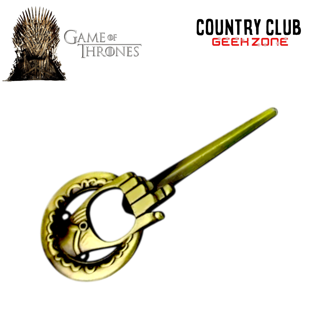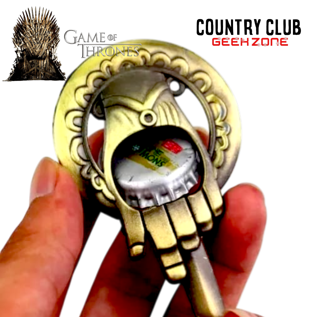 Con diseño detallado en forma de mano sosteniendo el emblema circular, este abridor combina funcionalidad y estética medieval, ideal para fans de la serie.