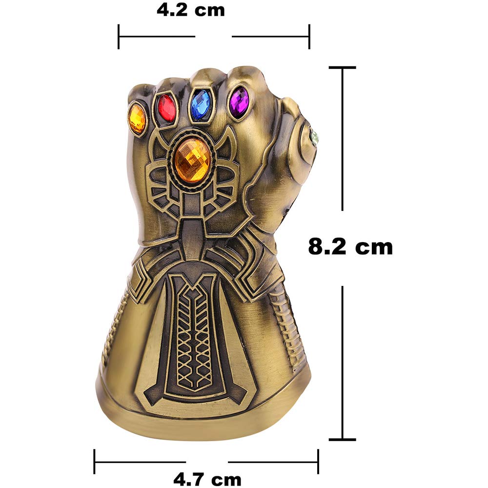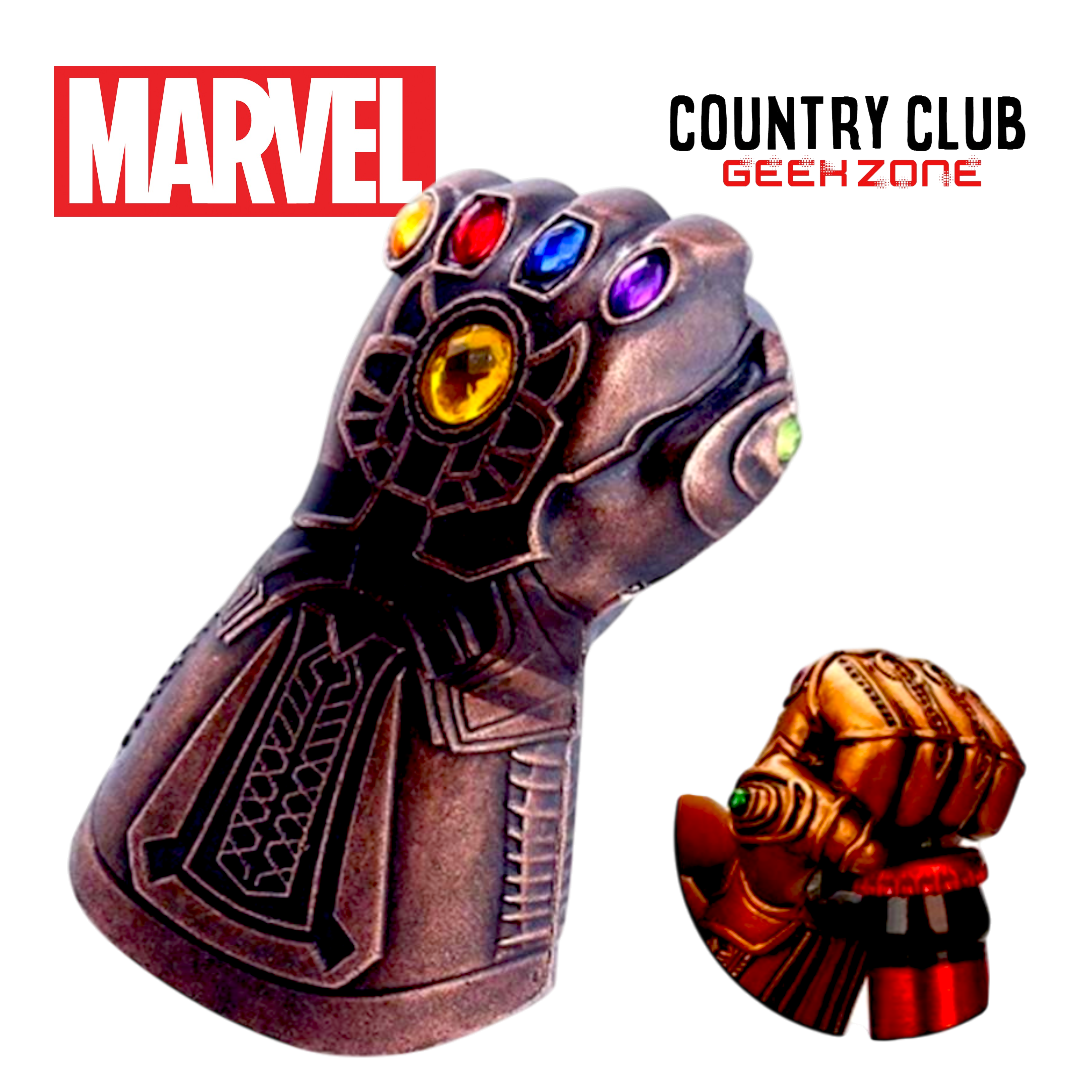 Diseñado con terminación tipo bronce envejecido y detalles en colores que simulan las Gemas del Infinito, combina estética coleccionable con funcionalidad real.