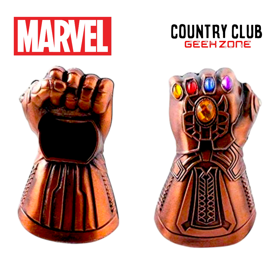 Destapador metálico inspirado en el icónico Guantelete del Infinito, con las seis gemas representadas en la parte superior.