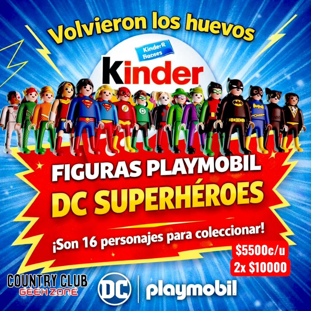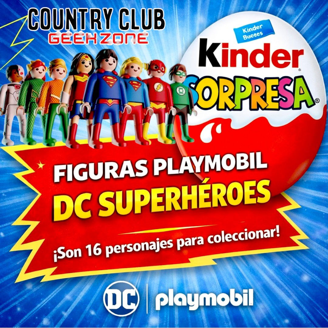 Los clásicos huevos Kinder presentan una edición especial con figuras Playmobil inspiradas en los personajes más icónicos del universo DC. Cada huevo contiene una sorpresa en su interior con una mini figura para armar y coleccionar.